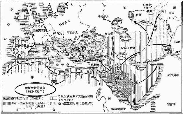 636年,一支阿拉伯军队打败了罗马(拜占庭)的叙利亚和巴勒斯坦守军,永久性地清除了罗马在这两个行省的势力。不久,其他阿拉伯远征军队攻占了美索不达米亚(641年)和埃及(642年)。到651年,伊朗也被兼并进由这些胜利而刚刚建立的伊斯兰教帝国的版图。先知穆罕默德(卒于632年)允诺的新宗教启示狂热激发了这些非凡的胜利。更为突出的事实是,穆罕默德激发的宗教信仰使残酷的阿拉伯征服者及其后人能够把一种新兴的、独特的伊斯兰文明嫁接在中东从历史上继承下来的、多种多样的且经常互相对立的、在文明之初就达到繁荣的文化之上。
