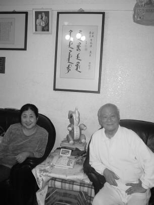 (摄于东普先生台北家中,墙上挂的是满族著名书法家马熙运先生为东老书写的满文书法)