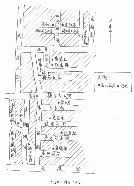 刘:唱戏的大部分都在南城,你像谭鑫培他们,都住在南城的往西,注184都住在那儿,后头原来都是相公堂子,后来成了妓院。好比我们住的米市胡同吧,包括李万春啊,高庆奎啊,钱金福啊,都在我们那儿住。注185房子便宜啊,房子又挺好。所以都在这儿买房,便宜,有一千块钱能买挺好的房子,有好几重院子。