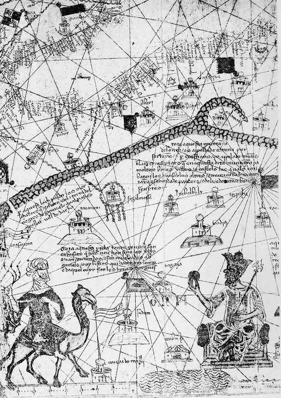 在非洲计划的背后,是一个非常古老的积极进取的基督教梦想:绕过伊斯兰世界,因为它阻挡了从欧洲通往耶路撒冷和东方财富的道路。有些地图上描绘了一位威风凛凛、富有帝王威仪的人物,身穿红袍,头戴主教冠,宝座是亮闪闪的黄金。那就是传说中的基督教祭司王约翰。他的神话可以上溯到中世纪早期。欧洲人相信,有一位非常强大的基督教君主,他居住在伊斯兰世界构成的障碍之外远方的某地。西方基督教世界或许可以与他联手,消灭异教徒。这个神话源自旅行者的故事、文学虚构(12世纪有人捏造了一封所谓的来自这位伟大国王的书信)和模糊的知识(即认为欧洲之外存在基督徒)。中亚有聂斯脱利派[6],东印度有圣多马的追随者[7],埃塞俄比亚高原有一个古老的基督教王国。传说祭司王约翰统率着庞大的军队,富得流油。据14世纪时的一份史料记载,他“比世界上任何人都更强大,也更富裕,拥有不计其数的金银和宝石”。[8]他的宫殿的屋顶和内壁都由金砖砌成,他麾下军队的兵器也是金的。到15世纪时,祭司王约翰的形象被认为就是埃塞俄比亚某些真实的基督教国王。有地图表明,通过穿越非洲中心的河流,就可以抵达他的王国。在一个多世纪的时间里,这种令人眼花缭乱的海市蜃楼将会对葡萄牙人的想象力和战略构成极大的吸引力。
