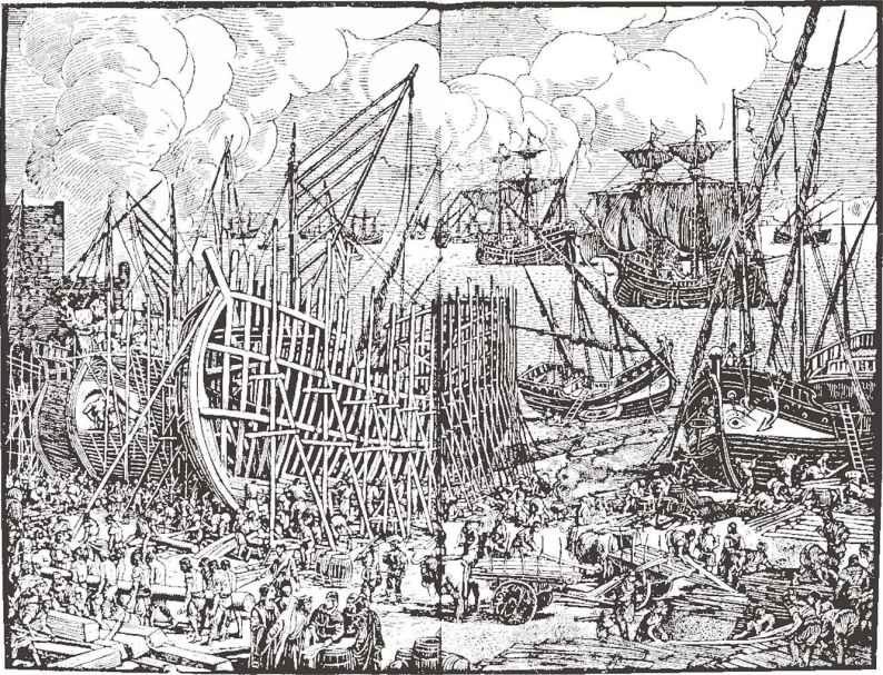 在里斯本船坞建造克拉克帆船,图右部有一艘卡拉维尔帆船停在海滩