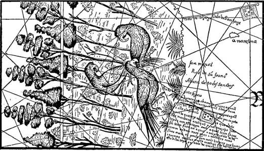 一幅著名的葡萄牙世界地图(坎迪诺平面球形图)复制品的局部,约1501年被人从葡萄牙偷偷带走。其细部第一次展现了巴西海岸,以及“大如母鸡”的鹦鹉