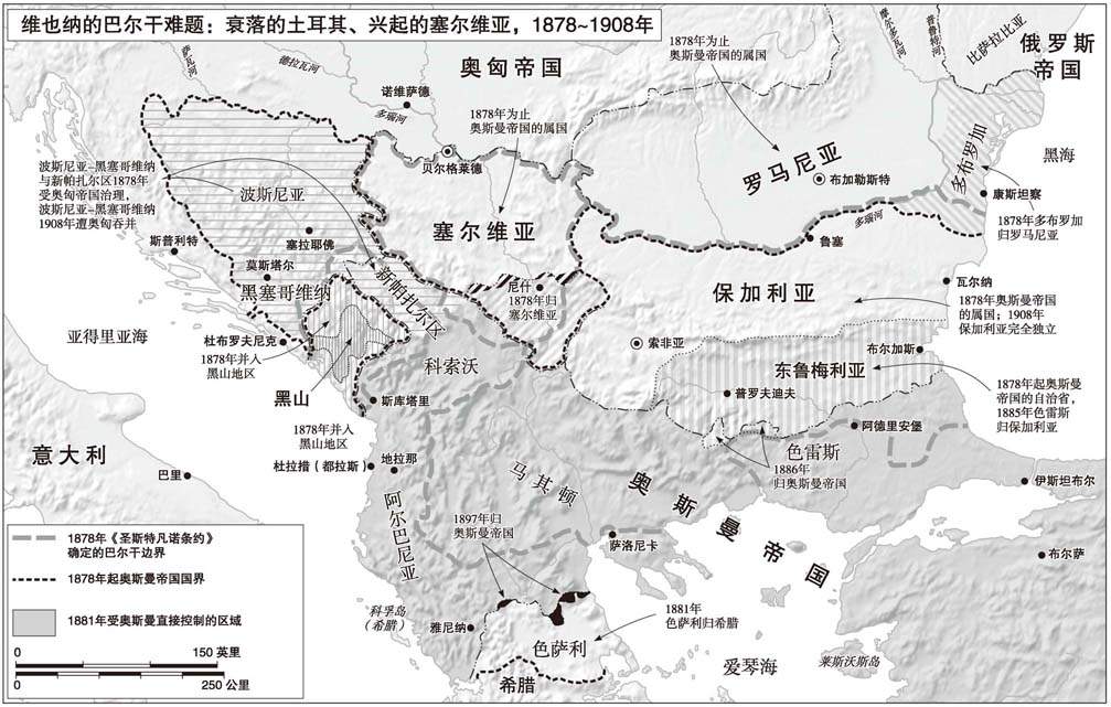 俄国在这一战略转向中选择塞尔维亚作为其重要盟友,对奥匈帝国来说大为不妙。塞尔维亚易受摆布且亲奥地利的奥布廉诺维奇(Obrenovic)王朝,一九〇三年遭亲俄且走强势民族主义路线的彼得·卡拉乔尔杰维奇(Peter Karageorgevic)推翻。国王彼得和其首相尼科拉·帕希奇(Nikola Pasic),看出欧洲两大病夫(奥斯曼帝国、哈布斯堡帝国)都积弱不振。一八七八年的柏林会议,在旧政策(扶持奥斯曼帝国)和新政策(承认从该帝国的巴尔干半岛诸省脱离自立的新国家,如希腊、罗马尼亚、塞尔维亚、保加利亚)之间达成痛苦的妥协,由于会议本身没有一以贯之的原则,从而为各种改变打开了大门。塞尔维亚觉得可以放手蚕食周边仍属奥斯曼帝国领土的省份,包括马其顿、新帕扎尔区(Sanjak of Novipazar)、科索沃、阿尔巴尼亚,甚至觉得可以放手将波斯尼亚-黑塞哥维那、匈牙利、克罗地亚、达尔马提亚境内受奥地利统治的两百一十万塞尔维亚人纳入管辖。[2]塞尔维亚人决意借与俄罗斯结盟之势往马其顿、阿尔巴尼亚境内扩张,开辟一条穿越新帕扎尔区抵达黑山和海滨的走廊,并开始摧毁哈布斯堡君主国,即塞尔维亚人所戏称为“由借来之羽毛制成的华丽俗气之鸟”。[3]