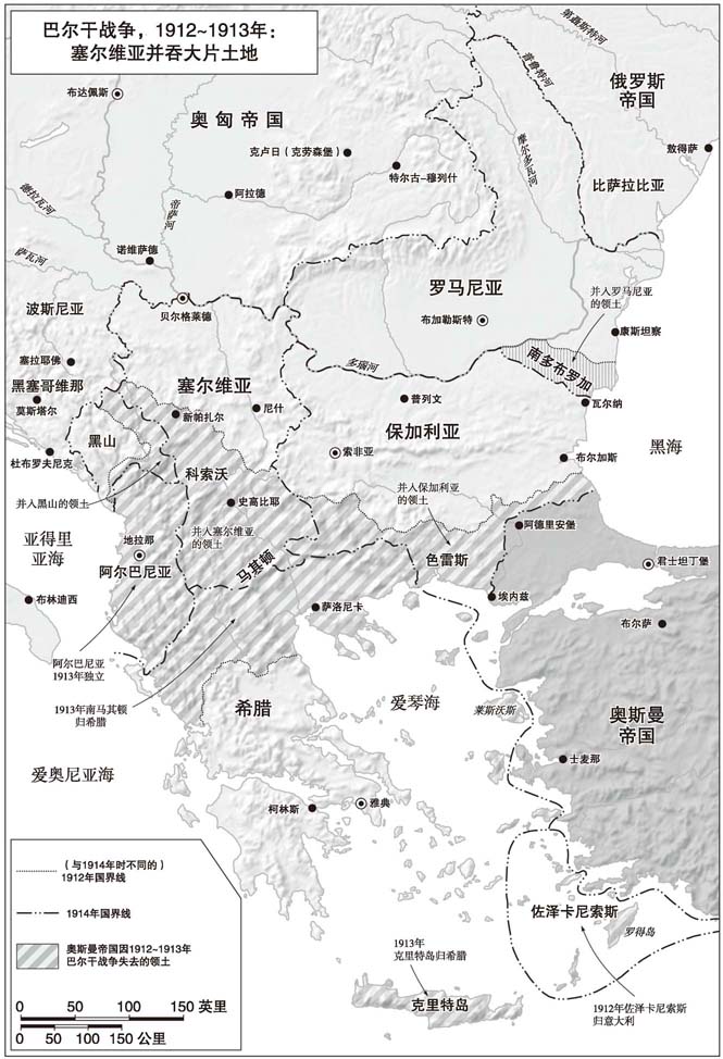 接着爆发的战争,使奥斯曼帝国失去大片疆土,使其陆军消亡殆尽。开战才三星期,五十万土耳其部队(在色雷斯的二十二万部队和在马其顿的三十三万部队),遭总兵力达七十一万五千人的巴尔干联军击败。希腊人拿下萨洛尼卡;保加利亚人进逼到君士坦丁堡城门;黑山人攻入科索沃和斯库塔里(斯库台);塞尔维亚人往南攻入马其顿,远至莫纳斯提尔(Monastir,马其顿语称比托拉/Bitola),然后十一月时挥兵向西抵达海边。由于希腊人和保加利亚人占领土耳其的爱琴海沿岸,塞尔维亚人即不客气夺取奥斯曼帝国阿尔巴尼亚境内滨亚得里亚海的四个港口:圣乔凡尼-迪梅杜亚(San Giovanni di Medua,阿尔巴尼亚语称圣金/Shëngjin)、阿莱西奥(Alessio,阿尔巴尼亚语称莱什/Lezhë)、都拉佐(都拉斯)、发罗拉(Valona,阿尔巴尼亚语称夫罗勒Vlorë)。一九一三年五月签署的伦敦条约,为土耳其在其欧洲诸省的统治敲响丧钟,因为奥斯曼帝国的巴尔干诸省大部分被转让给巴尔干联盟。奥匈帝国,欧洲的巴尔干强权,一无所获。维也纳的《时代周刊》以无法置信的惊讶口吻说道:“这场巴尔干危机使我们的外交遭逢如一八六六年的挫败。”[2]