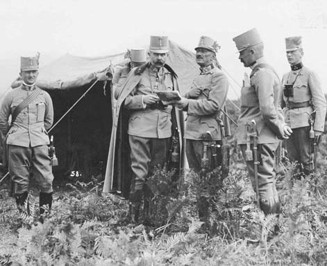 弗朗茨·斐迪南大公下令于一九一四年六月在波斯尼亚办一场动用两个军的特别演习,以威吓塞尔维亚人。照片中大公在研究地图,替他拿着地图者是军长和波斯尼亚行政长官奥斯卡·波蒂奥雷克将军。