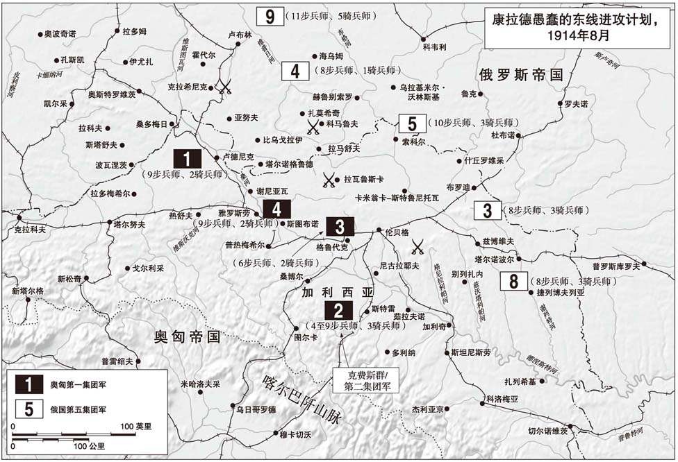 康拉德诸师这时得行走约一百六十公里才能抵达他们的进攻点,由此观之,康拉德的冒进更显鲁莽。康拉德想必知道,光是行军就会毁掉他以平民为主的军队。康拉德的青年时代回忆录讲述了他唯一的打仗经验(一八七八年在波斯尼亚),谈到当时夏季酷热带给士兵何等“说不出口的痛苦”,导致造成集体掉队乃至自杀。[12]康拉德若照原来的部署计划行事,他的部队会坐火车横越这酷热的一百六十公里路,结果,他的部队是在炙人的烈日下,靠双脚吃力开赴前线,一路吃辎重队、骑兵、火炮扬起的尘土。随行的牲畜(将陆续宰杀供奥地利每个军食用的七十头牛、两百头猪、三百只绵羊),一路叫,一路大便,令士兵更为痛苦。