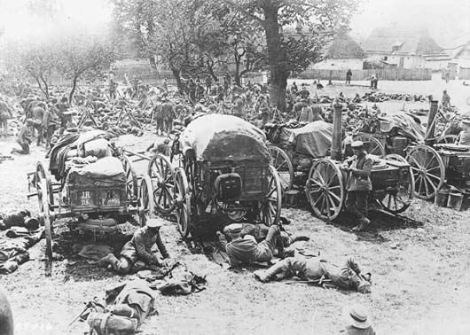 组织、武器、领军作战方面都优于奥军的德军,在戈尔利采-塔尔努夫攻势里再度大败俄军。照片中为一九一五年五月行军途中休息的德军。