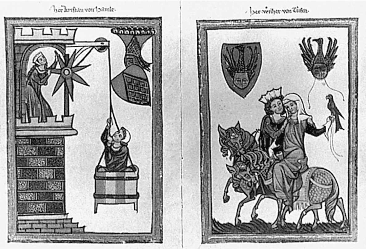 图2 14世纪马内赛古抄本中游吟诗人的插图。出处:Die Minnesinger in Bildern der Mannesischen Handschrift(Leipzig: Insel-Verlag, 1929)