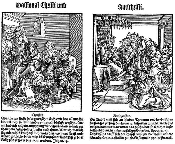 图6 《热情的基督徒与反基督教者》木刻画,老卢卡斯·克拉纳赫(Lukas Cranach)作品。这一系列作品作于宗教改革时期,将基督徒与反基督教者形成鲜明对比。而教皇尽管热衷于宗教仪式,却被归为反基督教者。翻印自:Weltgeschichte(Berlin: Ullstein, 1907—1909)。