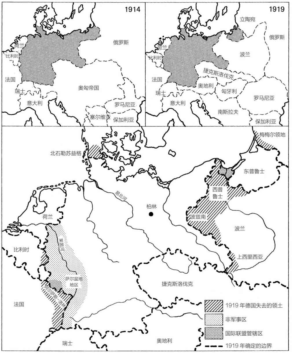 1919年初夏,严苛的《凡尔赛条约》签署。谢德曼辞职,鲍尔(Bauer)继任,并于6月28日派代表团签署了《凡尔赛条约》。德国损失了一大片土地:阿尔萨斯—洛林归还给法国,西普鲁士、上西里西亚和波森归还给新成立的波兰,而但泽将成为国际联盟管辖的自由市,“波兰走廊”将东普鲁士与德国其余国土分割开来。条约剥夺了德国的所有殖民地,并禁止德意志和奥地利以任何形式结盟。条约还将德国军队限制在10万人以下,莱茵河左岸也由协约国军事占领一段时间后再撤出。“战争罪条款”让德国背负了战争罪责。1921年1月,在巴黎召开的会议宣布了德国的战争赔款数额,它和《凡尔赛条约》的其他条款一样,激起了无数人的愤慨。