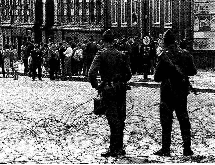 1961年,此前进行的土地改革引发了食物短缺,在这种情况下,东德打算采取激进的措施严防劳动力的流失。8月13日早晨,当柏林人醒来后,发现原本分成两半的城市定型了,街道上架起了带有倒钩刺的铁丝网,士兵守在一旁,之后迅速用混凝土和砖头搭起了更为坚固的城墙。边界不再只有几码宽,而是长达几千英里,家人和朋友从此两地分离。虽然西德人对此发起了抗议,但西方国家并不会因为柏林墙一事而去惹怒苏联。城市的分裂畅通无阻地进行着。