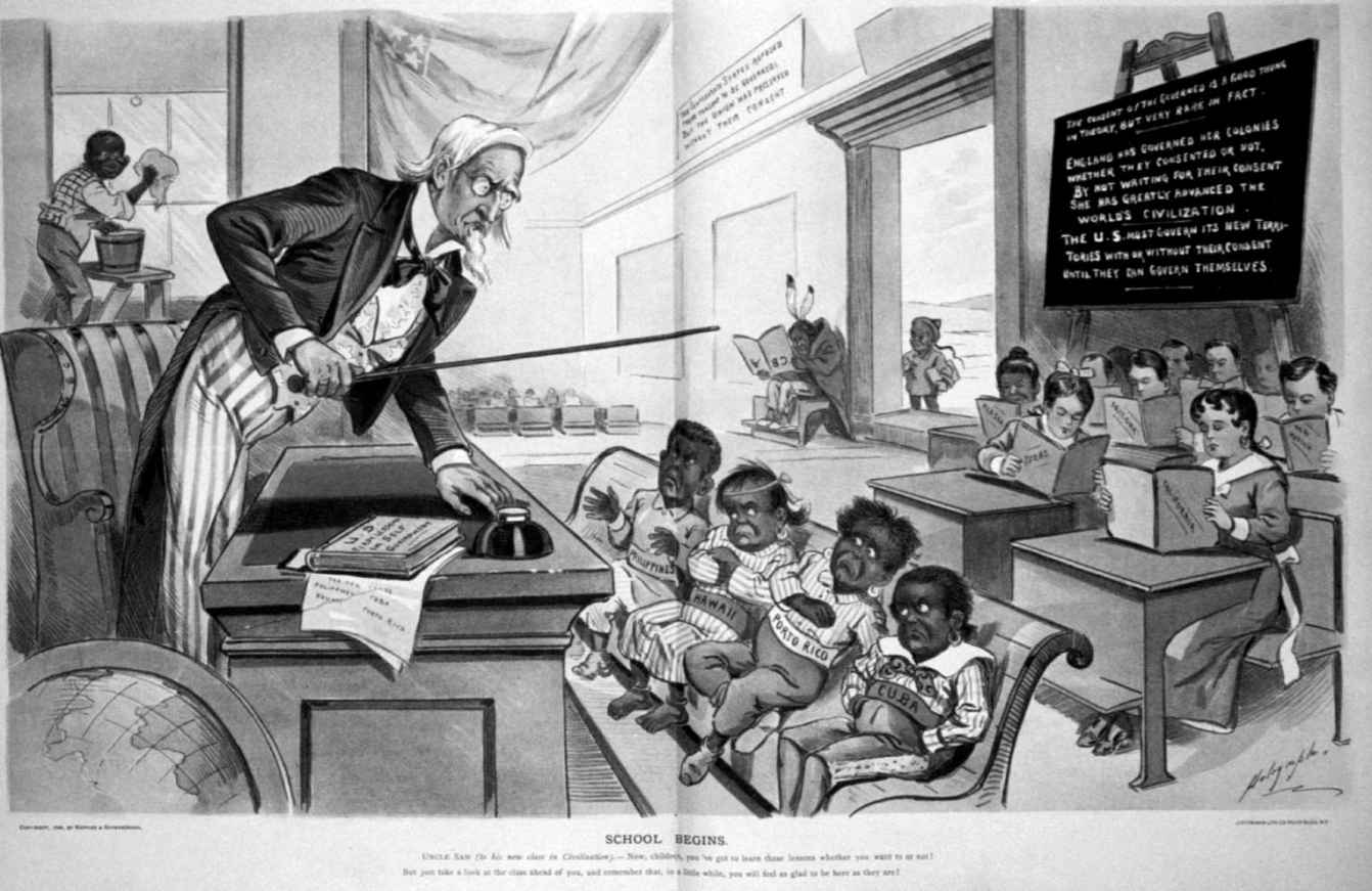 图46 《开始上课》(路易斯·达尔林普尔,1899年)。这幅漫画刊登在1899年1月25日的《顽童》杂志上,它表达了一些围绕美国新的帝国征程的担忧,以及用美国盎格鲁—撒克逊精神教育非白人的前景。在这幅漫画中,教师长着一副“山姆大叔”的模样,前排的四个小孩代表了菲律宾、夏威夷、波多黎各和古巴。后排的学生更加刻苦勤奋,他们手里拿着印有各州州名的书本。坐在门边的是一位美国土著,他把书本拿反了。另一位中国小孩在门口徘徊。在山姆大叔后面,一位非裔美国人擦着窗户。由美国国会图书馆印刷品与照片部友情提供(LC-USZC2-1025)。