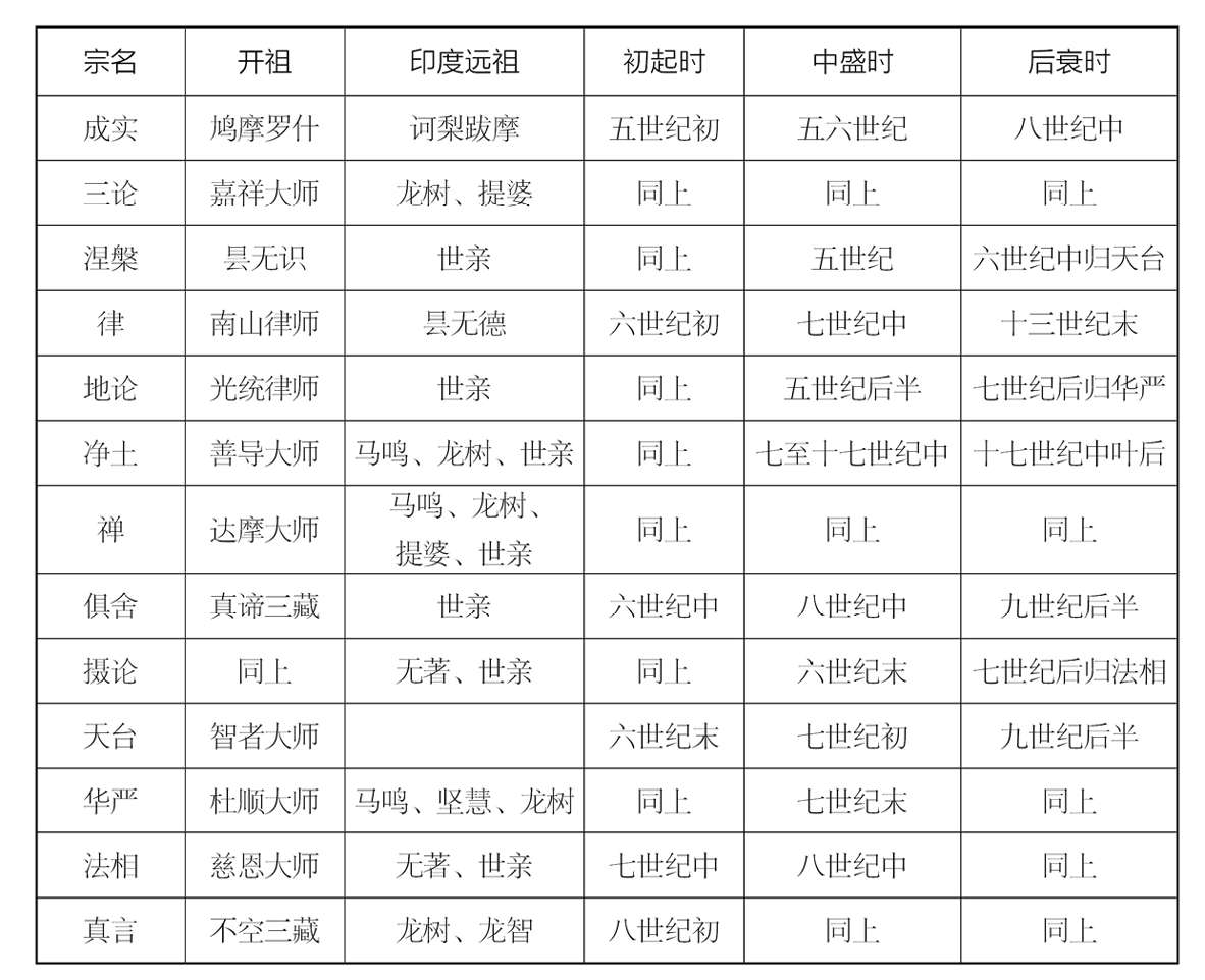 以上十三宗,除涅槃、地论、摄论三家,归并他宗外,其余十宗,俱舍、成实为小乘,余皆大乘。其中华严、天台、禅宗,印度皆无之。俱舍、三论,印度有而不盛。成实宗则印度创之而未行。
