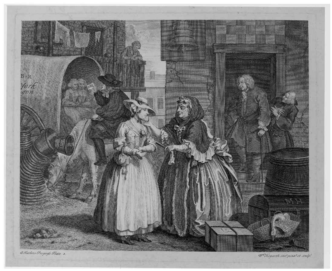 21.威廉·荷加斯,《一个妓女的历程》(1732)场景一:一个毫无防备的乡下姑娘在抵达伦敦后中了圈套。