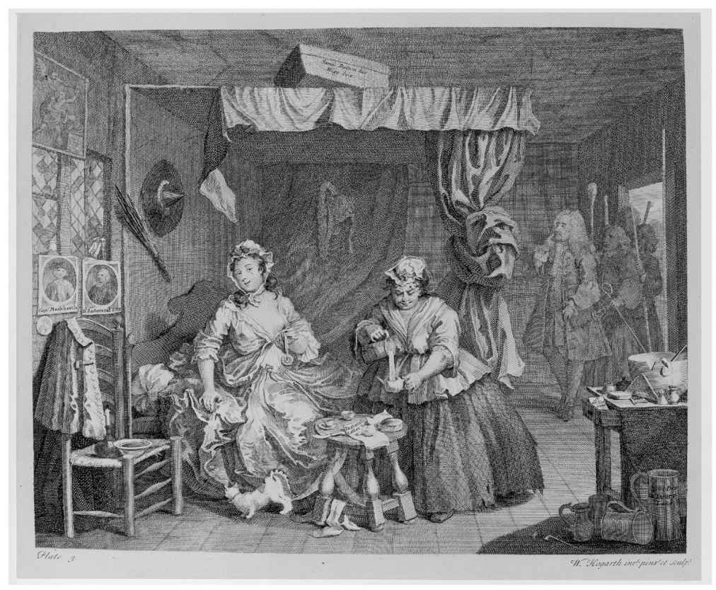 在1730年与1731年的几个月间,美术家威廉·荷加斯创作了英语世界有史以来最快流行的虚构画像。首先,他偶然想到创作由六幅图构成的一个连环画,以展现一个伦敦妓女的生命周期:从她初来乍到,单纯无知,随即被淫荡之徒诱奸,到她无可避免的堕落、染疾与死亡。数以百计的人来到他的画室赞赏这件油画作品。然后在1732年,他将其制成版画,卖给了一千多位订购者,立刻引起了轰动。在一份仅存于世的当时的记录中,他的同仁乔治·弗图写道,它们“作为印刷品,获得的巨大收益与公众认可是前所未有的”。《一个妓女的历程》“触动了大多数人的心灵,无论何种地位何种境遇,从最高贵至最低贱”。