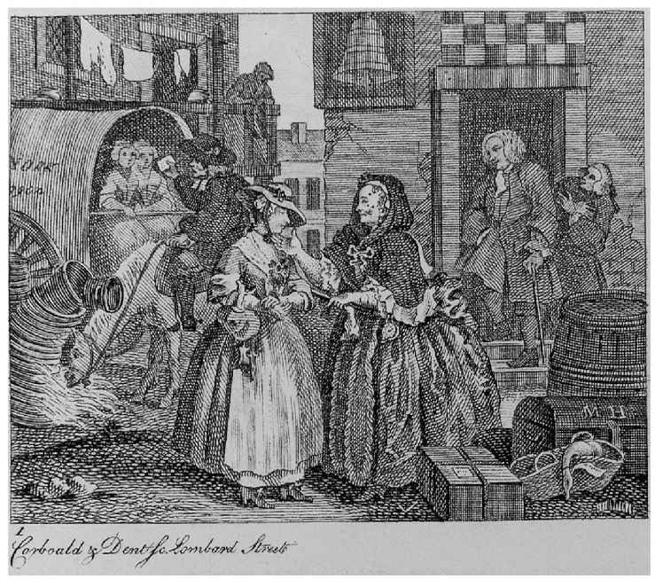 最后,我们可以在后世的视觉表现中考察其普遍的影响。在18世纪30年代,成熟的改编与戏拟之作有《罗宾的历程》与《瓦内拉的历程》,分别讽刺了首相罗伯特·沃波尔与威尔士亲王的情人安妮·范恩。半个世纪后,又出现了《摩登妓女的历程,或哈丽特·希德利斯奇遇记》,以及乔治·莫兰的《蕾蒂西亚:或诱奸》,两者都改动了原有的故事,并考虑到18世纪晚期人们的情感,提供了一个更幸福的结局。更普遍的则是特定细节的反复使用,或是通过图画本身,或是诉诸笔墨。通过这些方式,荷加斯的观念与图像得到了有意或无意的借用、重复与传播,其范围远远超过了他自己的顾客(见插图24至27)。