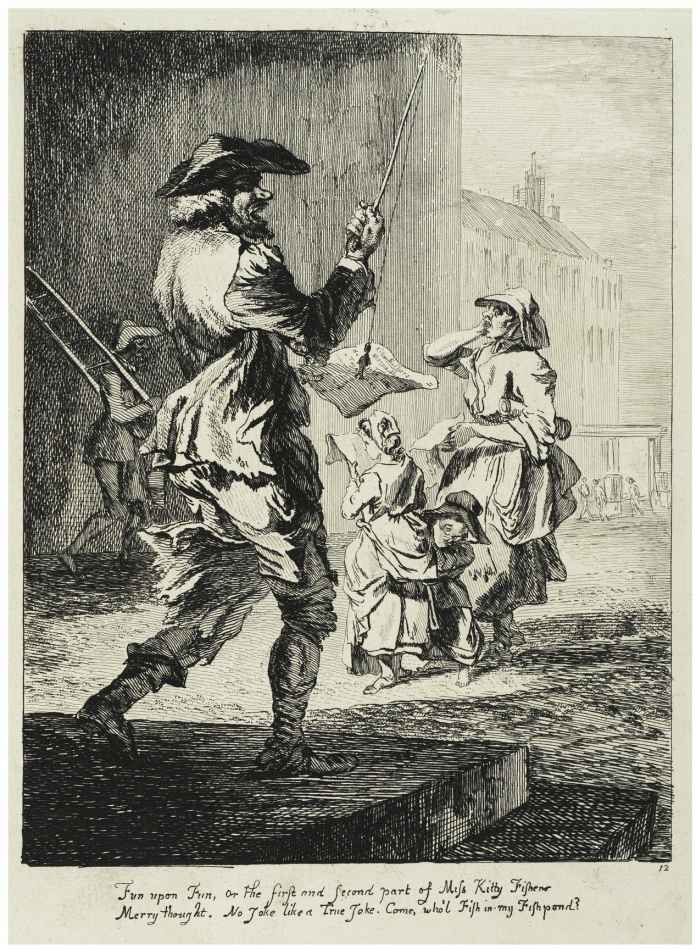49.这幅保罗·桑德比的纪实印刷品,展示了1760年一个售卖歌谣的家庭正在兜售关于基蒂·费舍尔的出版物(已佚)。为了引人注意,并为向她的名字致敬,这个男人把它们系在随身携带的钓竿上,喊着:“谁来我的鱼塘中钓鱼?”