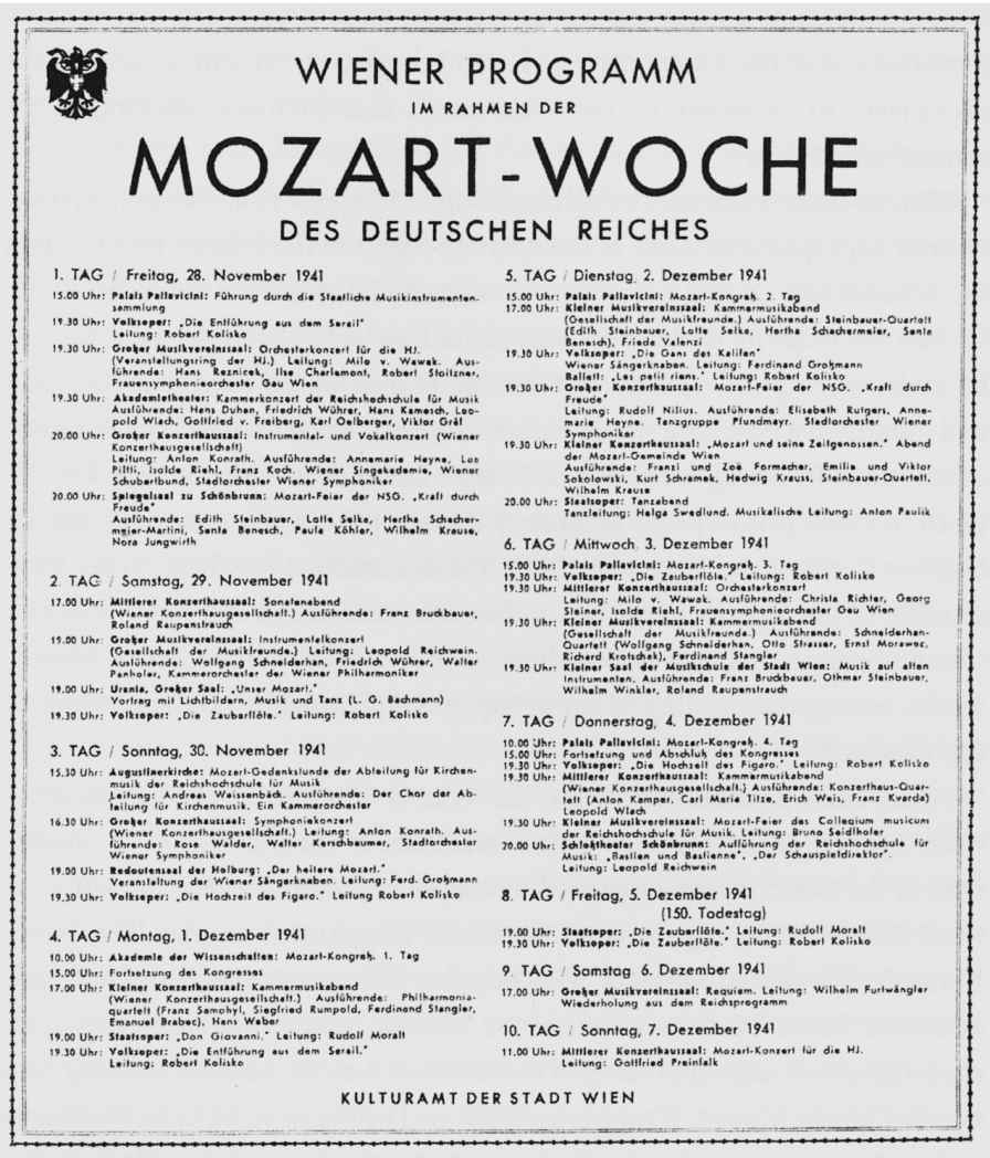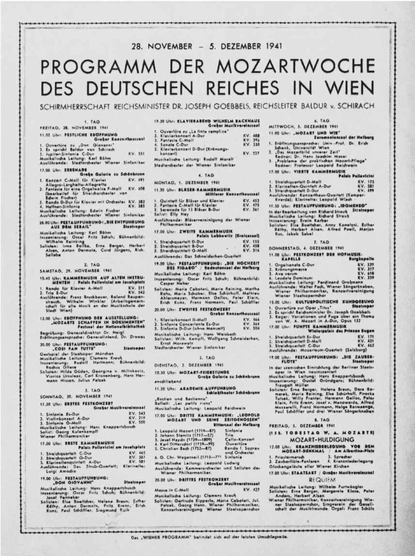 维也纳节目虽没有如此闪耀的明星阵容,但曲目则同样广泛,管弦乐和室内乐音乐会数量都不少。例如,市民歌剧院在头三天连续三晚分别上演《后宫诱逃》《魔笛》和《费加罗的婚礼》。必须注意到,12月5日《魔笛》的最后一场演出是专门为帝国国防军和军工从业者上演的,由此可见音乐节举行时的政治情境。