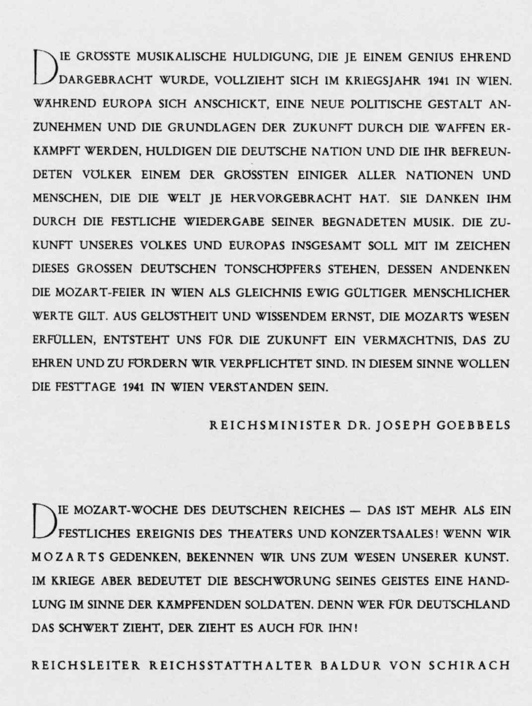 21.戈培尔和冯·席拉赫发表于莫扎特周特别纪念册首页的联合声明。