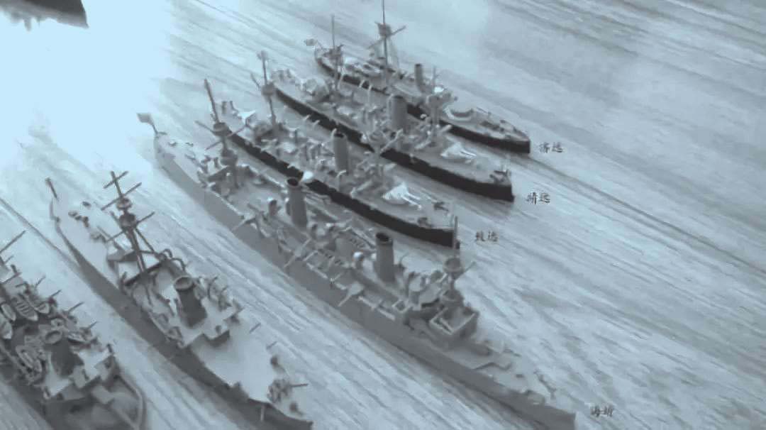 “海圻”号和之前北洋水师几艘军舰的对比,它的左边是当年要“撞沉吉野”的“致远”号,管带为邓世昌