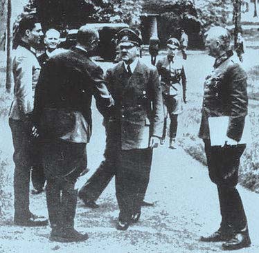 这张照片摄于1944年7月15日,地点就在希特勒总部“狼穴”。由左至右分别为施陶芬伯格、希特勒和威廉·凯特尔,与希特勒握手者为卡尔·博登沙茨。此时施陶芬伯格的公事包里便放有炸弹,但这次他并未引爆