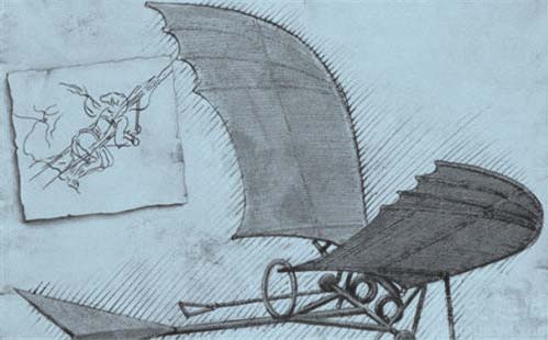 达·芬奇设计的“飞机”手稿。这种飞机主要是靠人力“扑翼”飞行