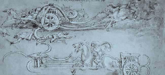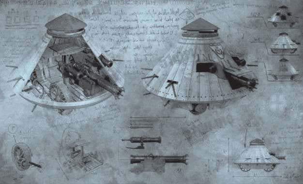 达·芬奇手稿中一个能够移动的奇怪炮塔的设计。这被有些人认为是“坦克”的雏形