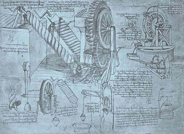 事实上,只要是和机械设计有关的东西,达·芬奇都非常痴迷。在他被发现的6000多页手稿中,人们看到了他设计的水下呼吸装置、拉动装置、发条传动装置、滚珠装置、反向螺旋、差动螺旋、风速计、陀螺仪甚至机械车的设计图……