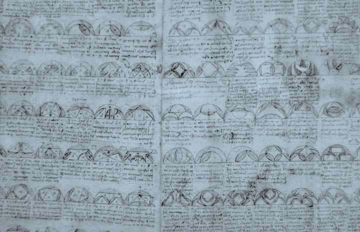 达·芬奇的手稿“等量的变化”。达·芬奇在相同尺寸的半圆和圆中,画出了177个等量变化。这说明他当时对几何学也相当感兴趣并做了研究