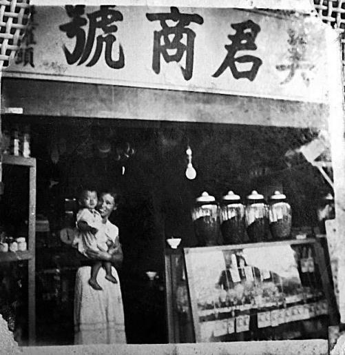 【图:一九五三年,摊子已成小店,美君抱着一岁的女儿,女儿叫「应台」。】