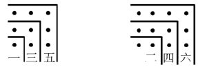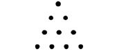 此象以“四之三角形”代表十数,明示一加二加三加四等于十。斯朴西坡斯Speusippos曾举十数之许多性质,谓系毕氏所发现者。例如数中之含有同等数之素数Prime number及合数Composite number者,十为其第一。斯氏所举果有若干真为毕氏所发现,不可得知。但相传毕氏于此有一结论,谓无论希腊人,或野蛮人,皆数至十而即复返于一,此乃依照天然者。吾人似可以此结论为系毕氏所得。此“三角数”明可无限扩大;以图象表示相续整数之和。此和名为“三角数”。依同理,相续奇数之和名为“正方数”;相续偶数之和,名为长方数。如下图:(同上,页一〇二至一〇三)