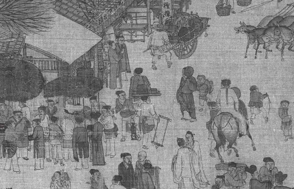 甚至大冬天与深夜时分,街上都有商贩“盘卖”:“其余桥道坊巷,亦有夜市扑卖果子糖等物,……如顶盘担架卖市食,至三更不绝。冬月虽大雨雪,亦有夜市盘卖。”——你别小瞧这种现在看来似乎毫不起眼的“夜市”。在中国社会史上,夜市的出现是划时代的,唐代及之前,城市实行宵禁制度,不可能有夜市,到了宋代,宵禁之制才被突破,城市中彻夜灯火通明,市民有了夜生活,夜市才可能形成。