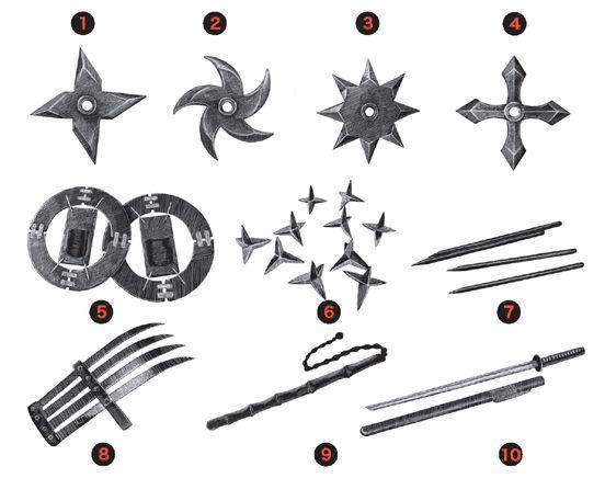 忍者随身携带的武器五花八门,其中有一部分是农业生产工具,比如镰刀、火箸、万刀等,这些武器表面上看起来只是普通的农具,所以不会引起他人的怀疑,而且它们可以成为攀爬房屋、掘土的工具。此外,最具代表性的武器是手里剑,分为棒状手里剑和车剑两种。手里剑形状多种多样,可有四、五、六、七、八角。由于手里剑刀刃并不会很长,对敌人伤害不会很大,所以忍者会在刃上涂毒,以期增大对敌人的伤害。