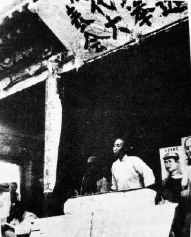 “一党专政”,曾是国民党遭政敌诟病最多的一个议题。《老照片》里曾经刊出过一张共产党领导下的抗日根据地民众集会的照片(图四),在主席台一侧的标语中,赫然写着“迅速结束一党专政”。可见,那时“一党专政”正是国民党的软肋所在,挑战“一党专政”自然也就成了反对派最具杀伤力的武器,大有一剑封喉的威力。平心而论,说国民党独裁(它自己称说是“训政”),并没有委屈它,从其执政的二十多年里,足以找出车载斗量的事实来证明这一点。