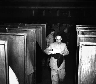 图五 1948年5月,“行宪”国大举行副总统选举,一位代表正走向会场专设的“秘密写票点”。
