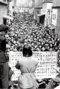 另有两幅当年被归入“不宜发表”后经《老照片》刊布出来的照片,是“三反五反”期间上海沪光电影院前即景(图三)和宣传队员在上海某里弄教唱歌曲(图四)。拍摄这两张照片,意在反映上海“三反五反”运动中强大的宣传攻势。原本张贴电影海报的电影院门前,糊满了巨幅宣传标语和宣传画;而一向宁静、温馨的弄堂,也变得人头攒动,群情激奋,男女老少被召集起来学唱“同一首歌”,不过歌名是“两条道路由你挑”,其中唱道:“不法奸商你听着,两条道路由你挑……”听着这般众口一词吼声,住在弄堂里的那些中小工商业者们即使没有做过什么不法之事,怕也要胆战心惊吧?