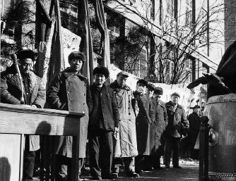 图一 1967年1月16日,地质部机关的造反派召开夺权大会,宣布“地质部革命造反委员会”成立,何长工等原地质部领导被赶到会上示众。