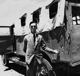 1937年,孙明经参加西北考察团,途中在一辆弹痕累累的军车旁留影。