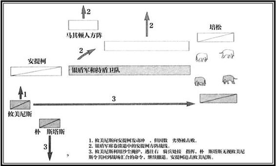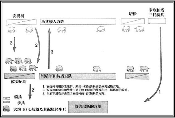 ◎ 伽比埃奈会战的尾声。在伽比埃奈会战以及更早的拉米亚会战、赫勒斯滂会战中,高素质的方阵部队都在遭受骑兵侧后威胁的情况下结阵退出了战场,这一情况体现了大部分无马镫骑兵对重步兵的无可奈何。
