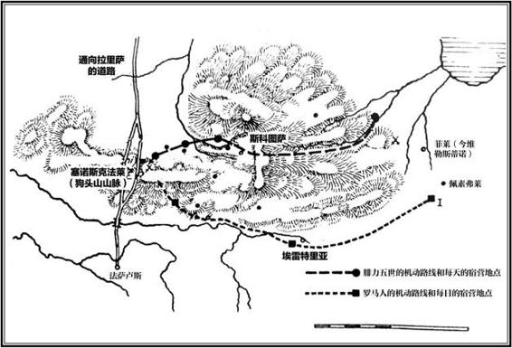 分处色萨利的狗头山山脉南北两线,罗马军队(2个军团、2个同盟军团,加上希腊盟军,总计2.6万人)和马其顿军队(2.35万名步兵和2000名骑兵)都以山脉和大雾天气隐藏自己的行踪,同时向西行军。在连续三天失去对方的踪迹后,两位指挥官在第四天都试图以轻装部队占领行军方向侧翼的制高点,这就导致了两军之间的前哨战。