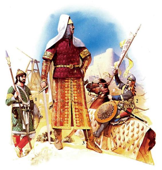 ◎ 阿尤布王朝的军队(12世纪晚期至13世纪早期)。1为萨拉丁,2为塔瓦士贵族骑兵,3为卫兵。