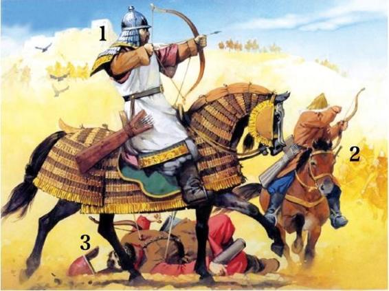 ◎ 1220年中东的蒙古骑兵。1为蒙古重装弓骑兵,2为蒙古轻装弓骑兵,3为波斯步兵弓箭手。