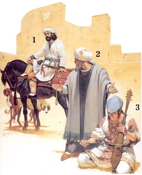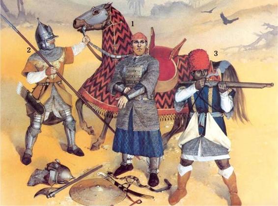◎ 最后的马穆鲁克军队(1500-1517)。1为卡萨基亚卫队,2为前苏丹招募的马穆鲁克,3为北非苏丹火枪兵。