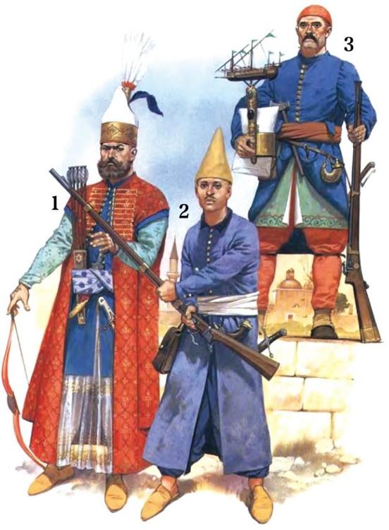◎ 1为耶里尼新军军官,2为奥斯曼滑膛枪火枪手,3为耶里尼新军海军。