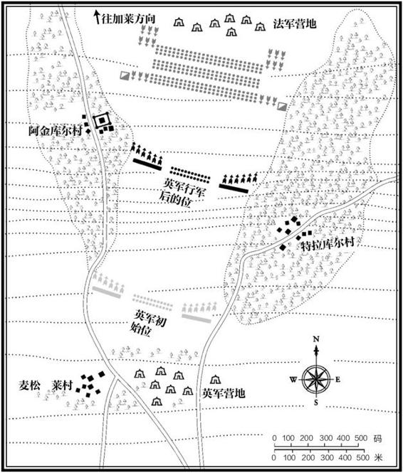 ◎ 阿金库尔会战示意图。英军选择了极其狭窄的地形建立防线,而法军则选择正面突击。