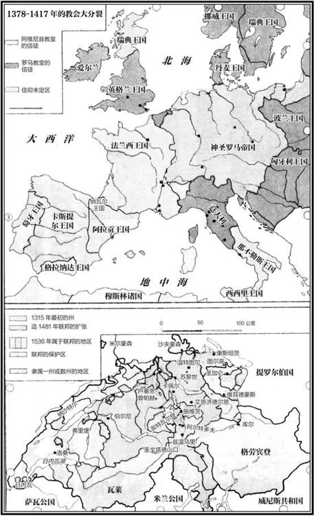 ◎ 上图为1378-1417年的教会大分裂,下图为1536年的瑞士联邦地图。