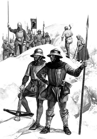 ◎ 当时的林州步兵。左为弩手,身穿羊毛紧身裤与罩衫,短袖锁帷子,头上戴着壶盔,腰带上的铁爪是用来拉开弩机的;右为长矛手,腰上是斧头与匕首。