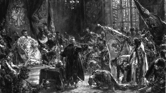 ◎ 献俘阙下(扬·马泰伊科作),描绘沙皇舒伊斯基被带到华沙议会的场景。左侧坐者为齐格蒙特三世,中间黑衣立者为茹凯夫斯基。