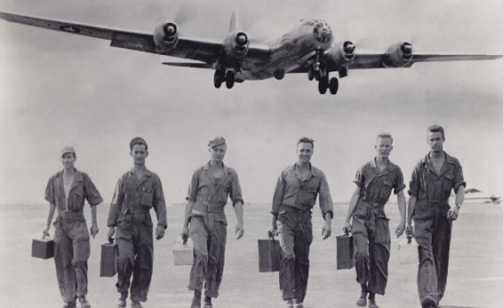 疲倦地返回基地之后,一架波音B-29 轰炸机再次腾空而起;从它的肚子下面钻出来的两位飞机工程师,刚刚填补了它身上的高射炮弹孔,替换上脱落的起落架。在维修保养中心,飞机工程师们昼夜不停地工作,更换零件、修理保养、调试,目标一致地将这架巨型轰炸机送上天空。这群开心的地勤人员从停机坪走过来,对自己的工作心满意足。左起:麻省的弗兰西斯·达利技术军士、路易斯安那州的弗兰克林·布莱恩一世技术军士、堪萨斯州的孪生兄弟劳伦斯·华纳及列那多·华纳技术军士、威斯康星州的乔治·科雷恩技术军士、俄亥俄州的尤金·菲尔雷技术军士。