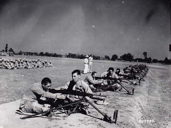在印度兰姆伽训练中心,美国教官教中国军队高级军官如何使用英国布伦式机关枪。图中,上等兵施瓦茨在教吴子兴(音)上校(前方两人)机枪射击。